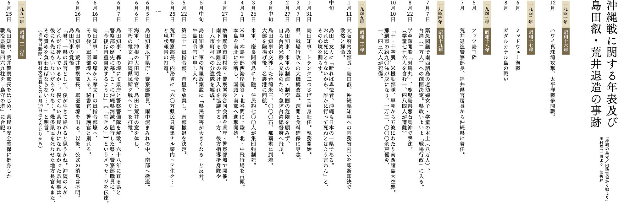 日本が総力戦へと突っ込んでいった沖縄戦末期、本土より派遣された2人の内務官僚がいた。兵庫県出身の知事・島田叡氏と栃木県出身の警察部長・荒井退造氏である。