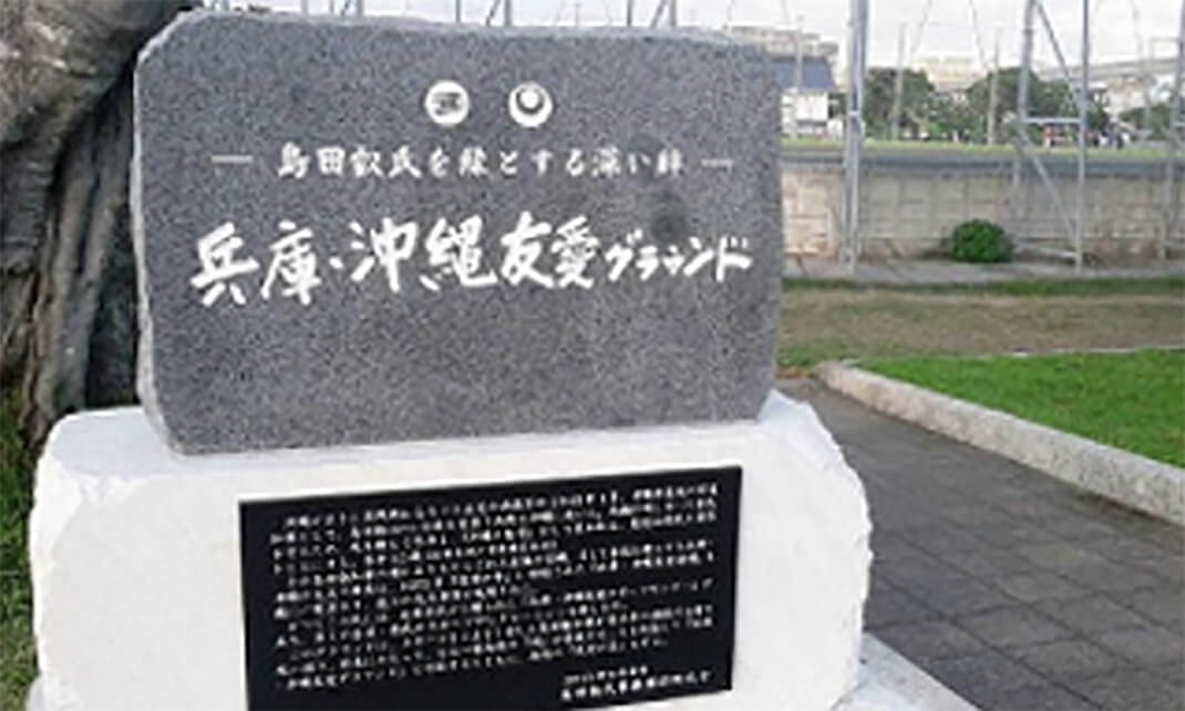 島田叡の母校である兵庫高校には卒業生である島田叡を後世まで顕彰するため建てられた碑がある。この「合掌の碑」は、遠く沖縄の方向を向いており、合掌をしているデザインとなっている。兵庫・沖縄友愛グラウンドに建てられた島田叡顕彰碑と向き合っている。また沖縄、兵庫両県は1972年、沖縄の本土復帰の年に友愛提携を結び、兵庫県は1975年に「沖縄・兵庫友愛スポーツセンター」を寄贈。現在、プロ野球の巨人がキャンプ中にサブグラウンドとしている場所は「兵庫・沖縄友愛グラウンド」と命名されている。